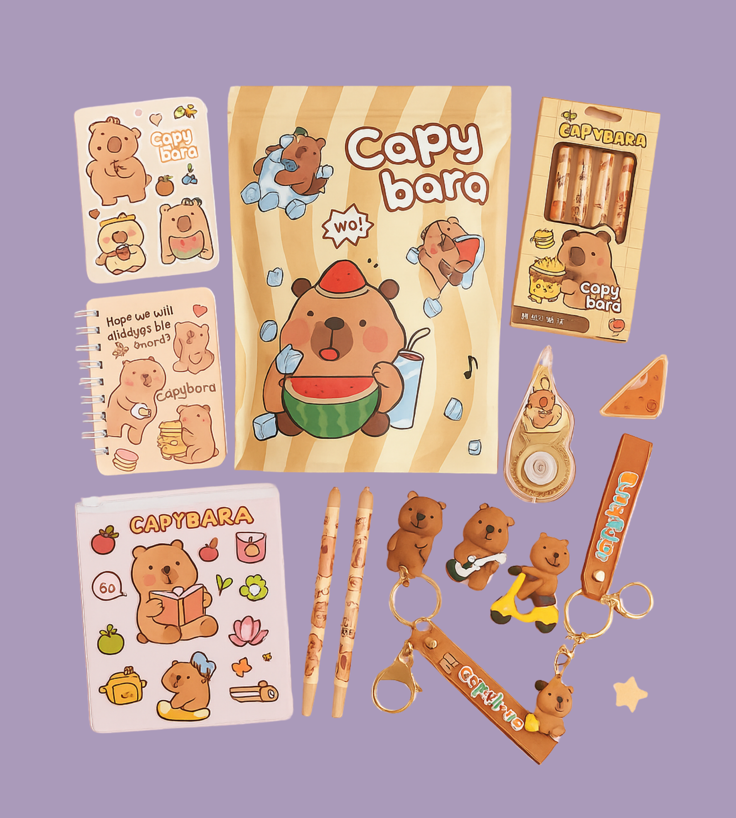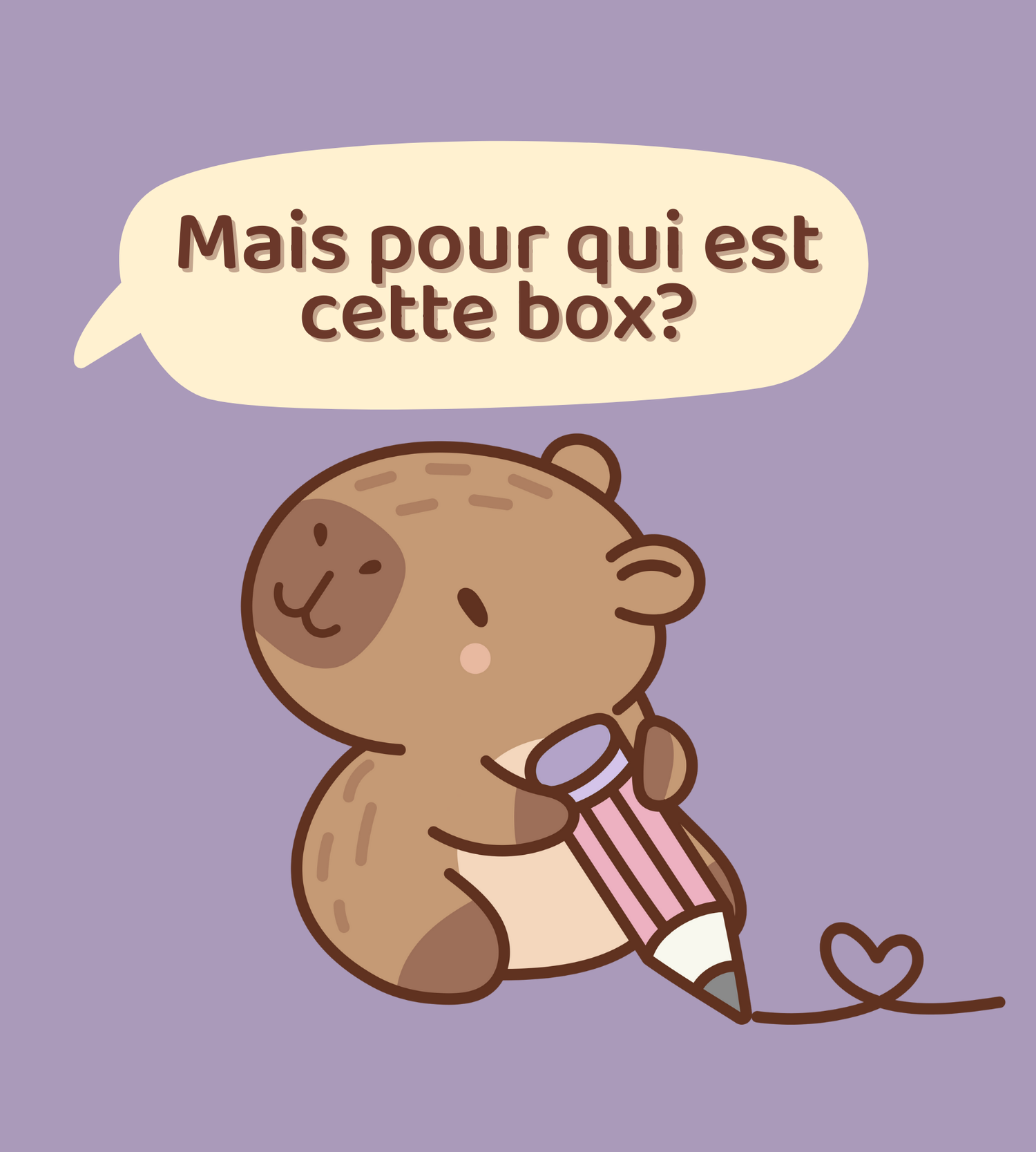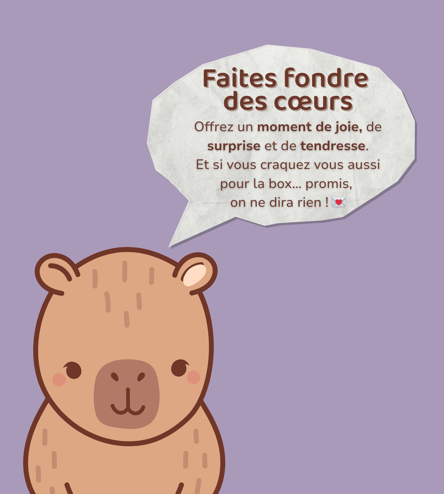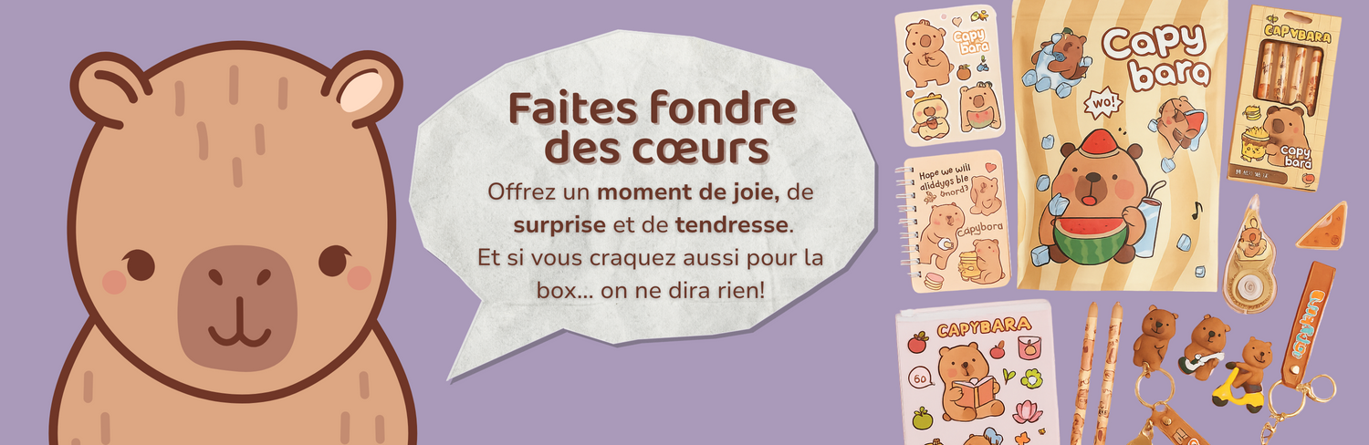 Chaque box contient entre 8 et 10 articles soigneusement sélectionnés autour de l’univers kawaii et Capybara :